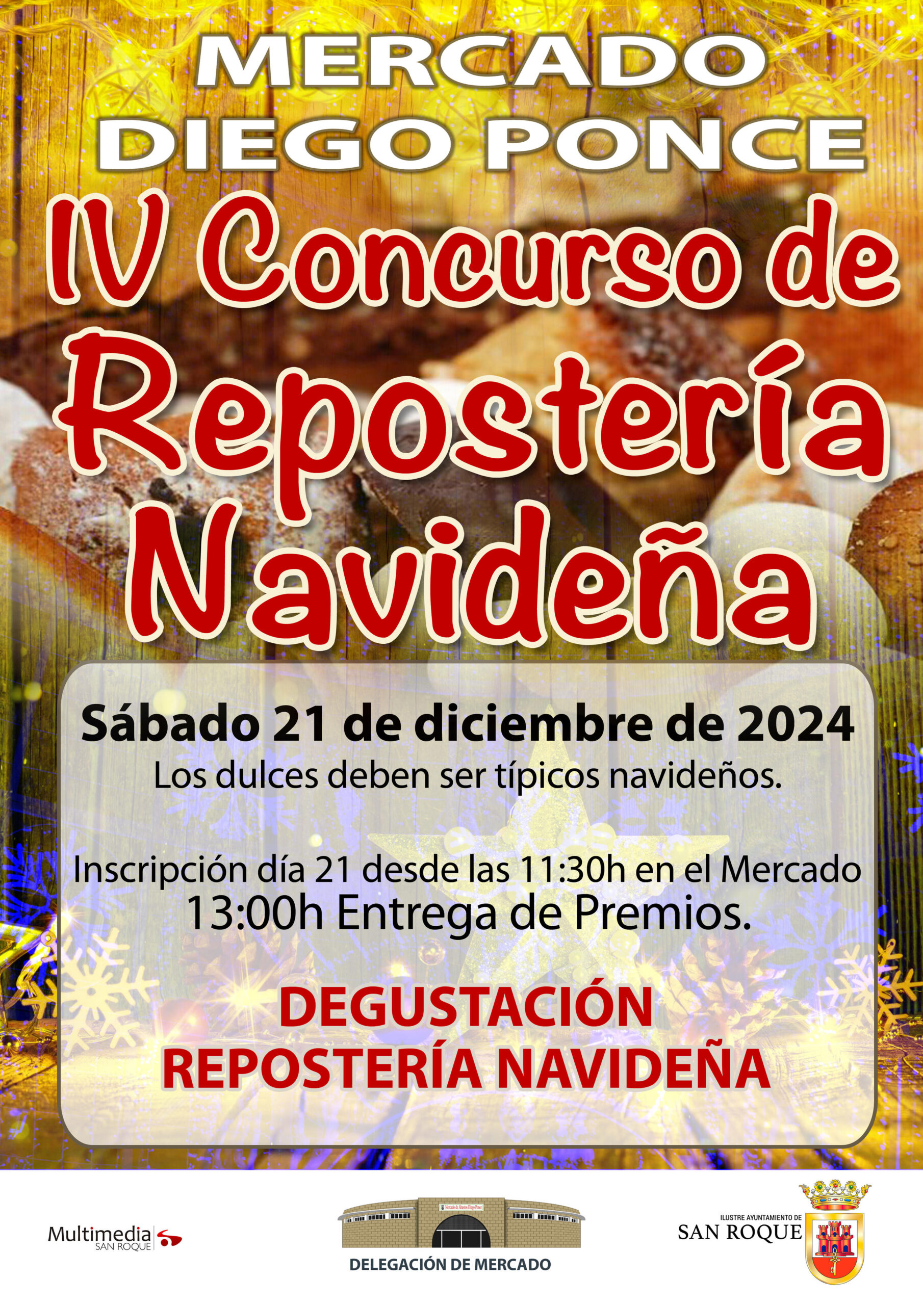 La delegación de Mercados del Ayuntamiento de San Roque pone en marcha el IV Concurso de Repostería Navideña, que va a tener lugar en el Mercado Diego Ponce el sábado 21 de diciembre de 2024, dentro de «Navidad en el Mercado Diego Ponce».
