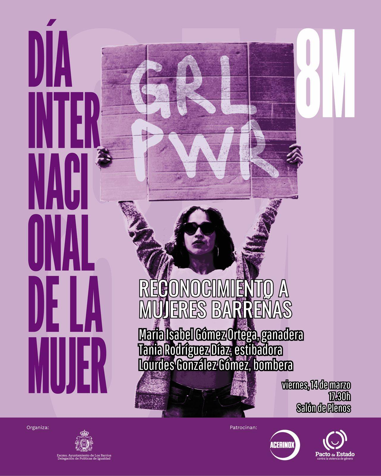 El viernes 14 de marzo, a las 17:30 horas en el salón de plenos, se celebrará un acto de reconocimiento a tres mujeres barreñas como parte de la programación prevista con motivo del Día Internacional de la Mujer.