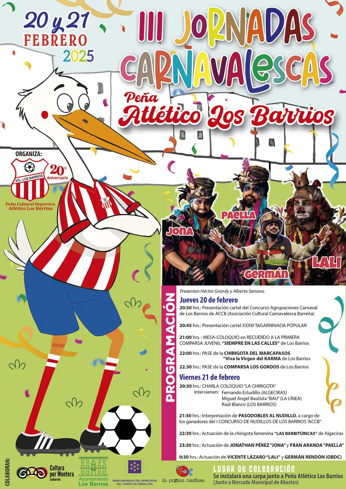 El delegado de Cultura y Festejos, Daniel Pérez Cumbre el vicepresidente de la Mancomunidad de Municipios del Campo de Gibraltar, Pablo García, han dado a conocer hoy el cartel de las III Jornadas Carnavalescas, que organiza la Peña Cultural Deportiva ‘Atlético Los Barrios’, con la colaboración del Ayuntamiento.