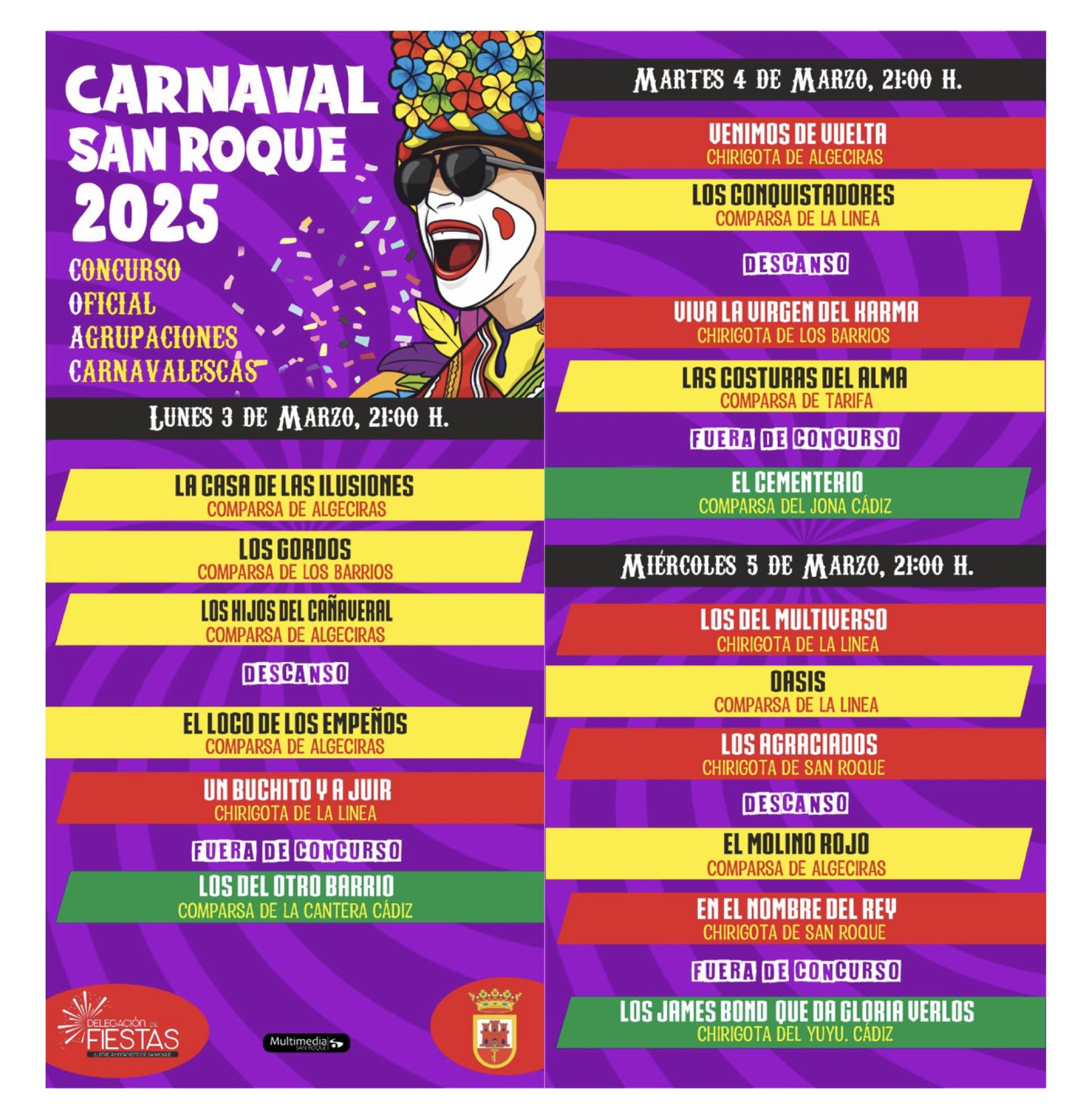 En el concurso del Teatro Juan Luis Galiardo participan un total de 14 agrupaciones: cinco procedentes de Algeciras, cuatro de La Línea, dos de San Roque, dos de Los Barrios y una de Tarifa, siendo ocho comparsas y seis chirigotas. Las tres semifinales y la Gran Final del viernes comenzarán a las 21.00 horas, y todas ellas podrán seguirse en directo a través de Canal San Roque RTVM en TDT, en la OTT y en redes sociales.