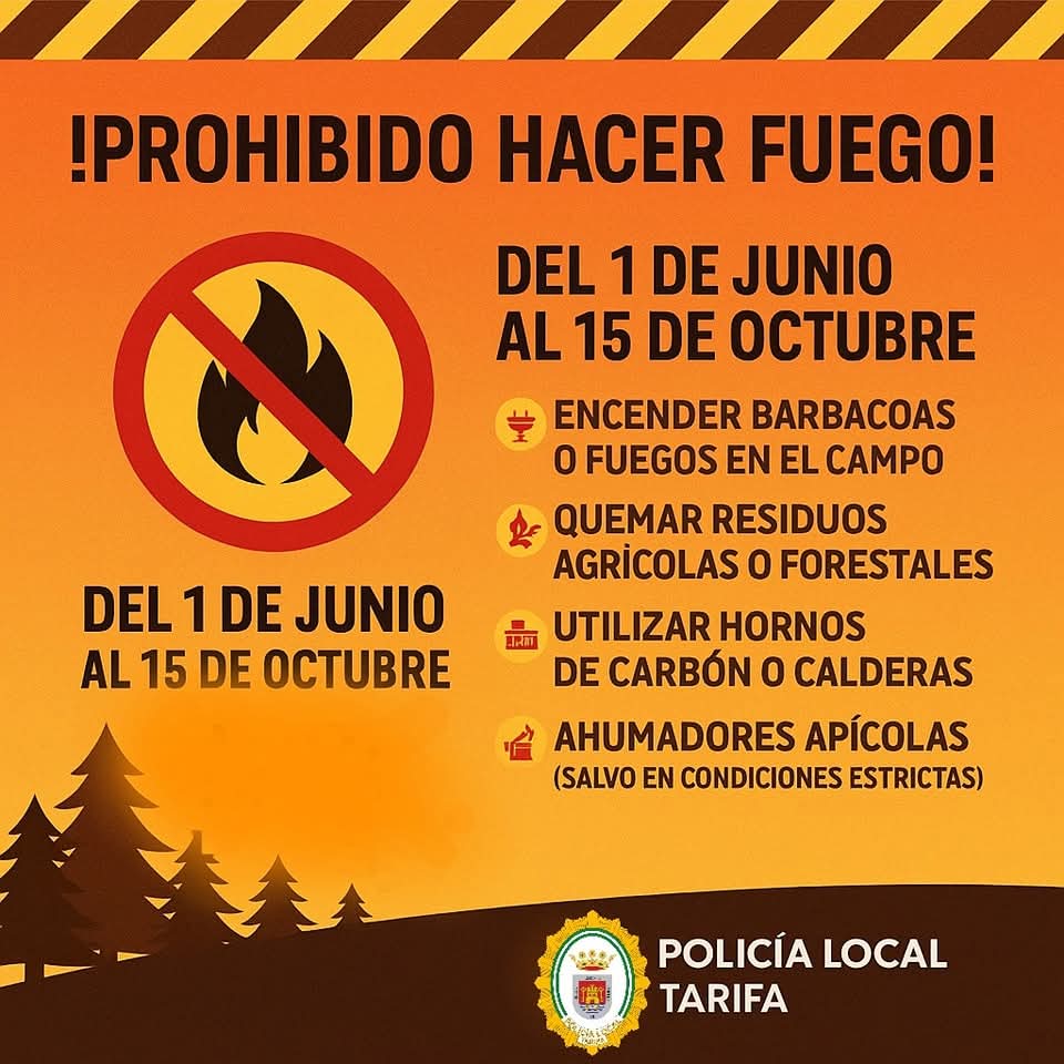 La Policía Local de Tarifa ha lanzado un aviso importante a la ciudadanía ante la llegada del verano: desde el 1 de junio hasta el 15 de octubre, queda terminantemente prohibido el uso del fuego en terrenos forestales y sus zonas próximas, como medida de prevención contra incendios forestales durante los meses de mayor riesgo.