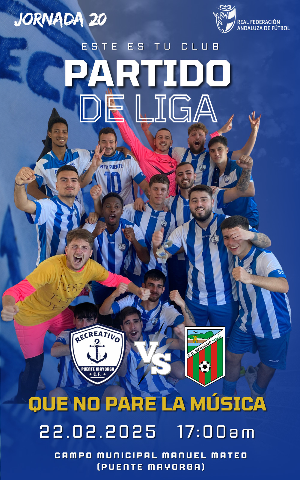 El Recreativo Puente Mayorga Club de Fútbol celebrará el encuentro correspondiente a la vigésima jornada de Liga en Tercera Andaluza Cádiz, Grupo 2, en el Manuel Mateo ante un Club Deportivo Benalup venido arriba y asentado en la segunda plaza. El partido será este sábado a las 17.00 horas y estará dirigido por Sánchez González.