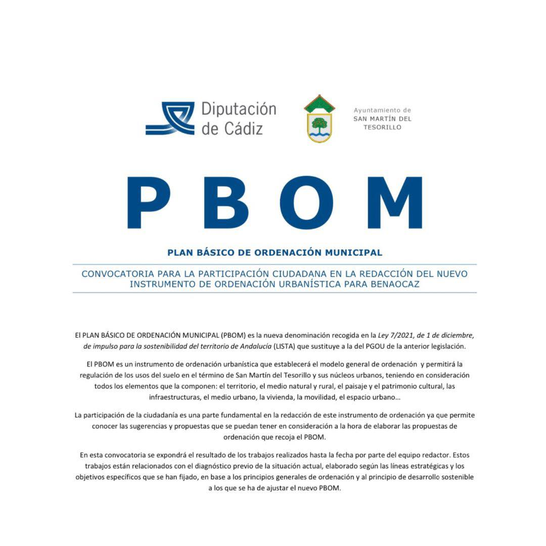 En esta convocatoria se invita a vecinos, asociaciones, empresas y a todas las personas dispuestas a aportar sugerencias y conocer los avances de este instrumento. Se recuerda que el PBOM es un instrumento fundamental que establecerá el modelo general de ordenación y regulará los usos del suelo en el término municipal y sus núcleos urbanos.