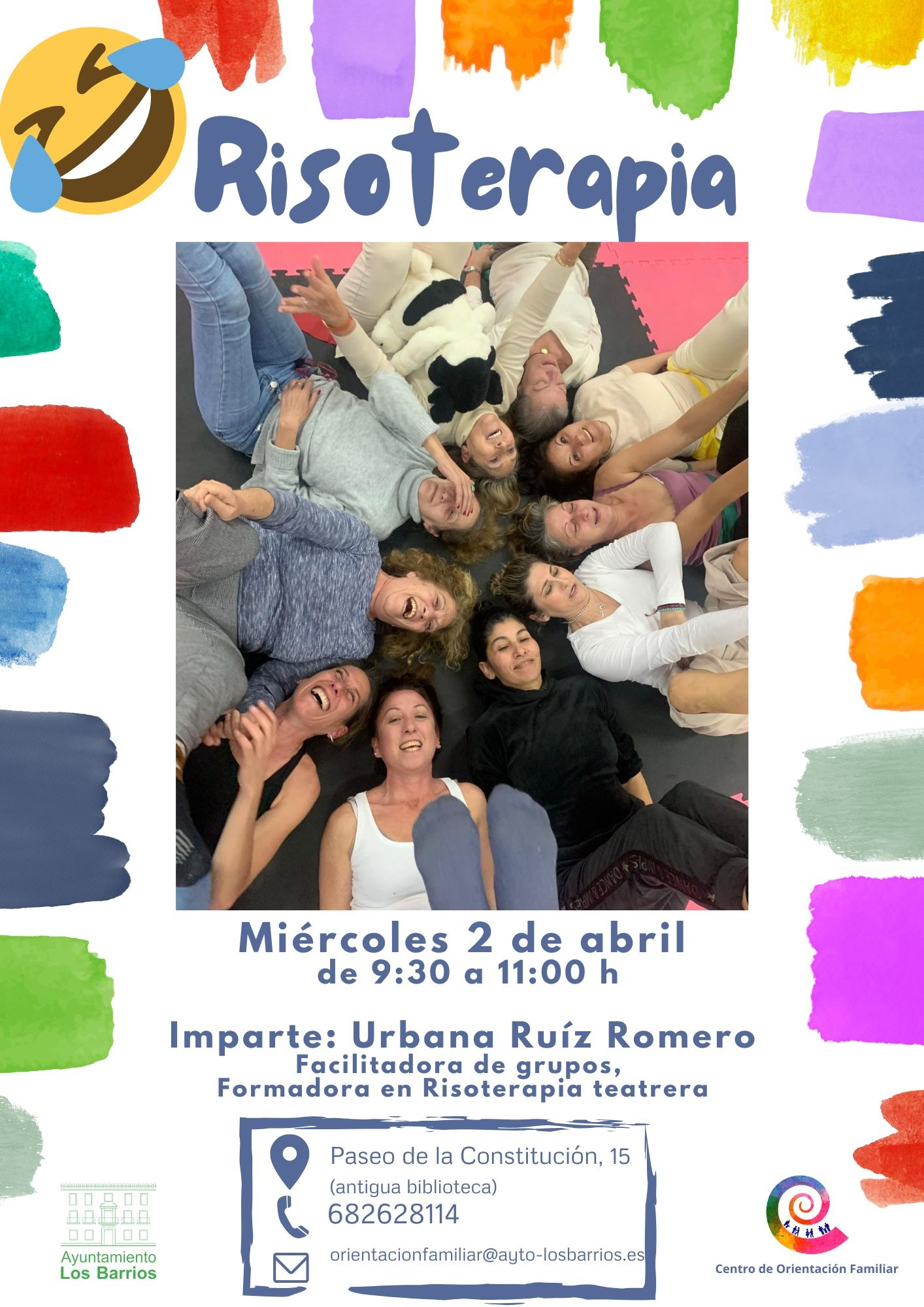 El Centro de Orientación Familiar, bajo la dirección del concejal Carlos Torres, ofrecerá esta semana una sesión dedicada a la risoterapia. La formación será impartida por Urbana Ruíz Romero, facilitadora de grupos y formadora en risoterapia. El taller se llevará a cabo el miércoles 2 de abril, de 9:30 a 11:00 horas, en la sede del Centro de Orientación Familiar, ubicada en el Paseo de la Constitución (antigua biblioteca).