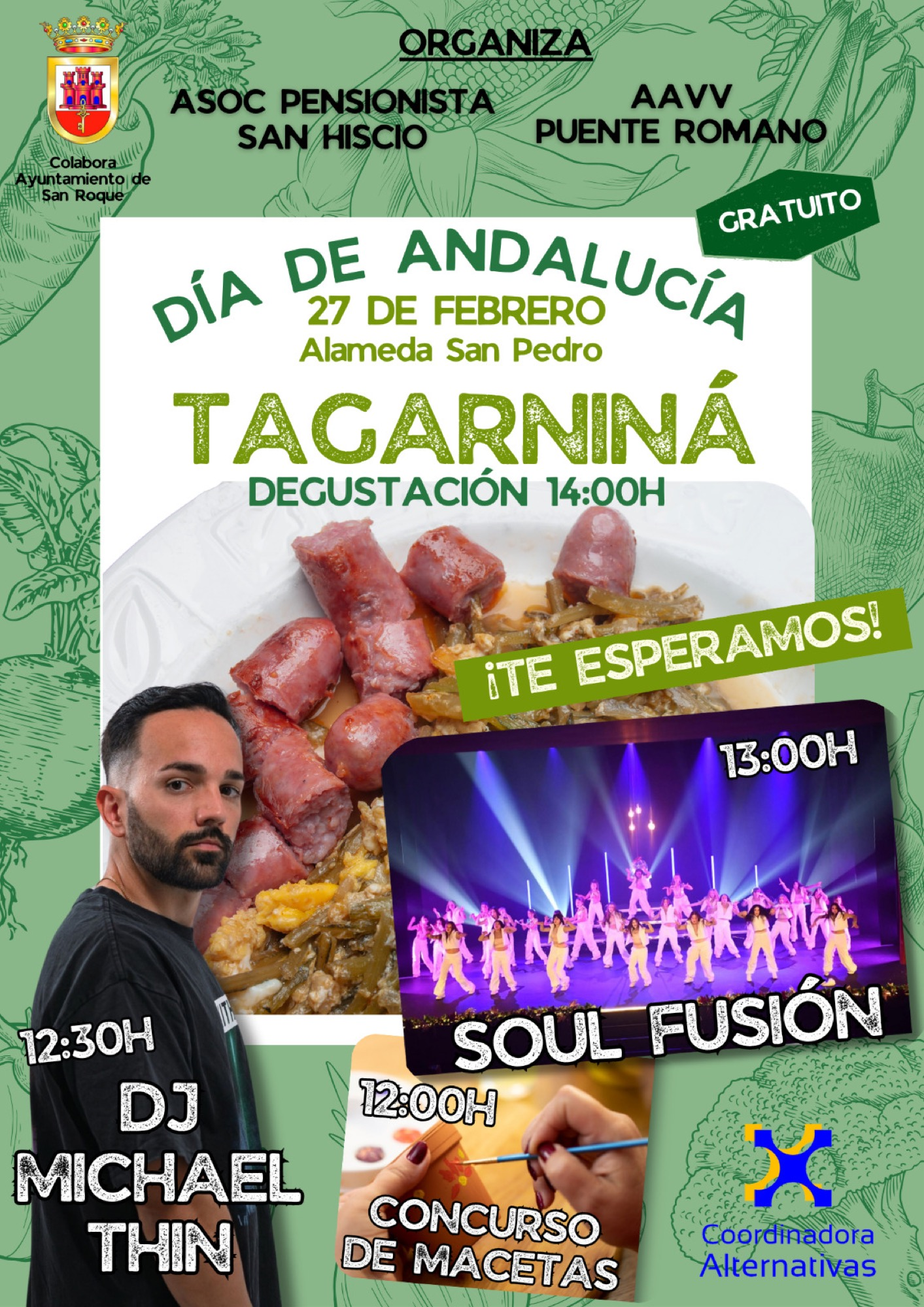 Con motivo de la celebración, el viernes 28, del Día de Andalucía, la Asociación de Pensionistas San Hiscio y la Asociación de Vecinos Puente Romano organizan para el jueves 27 a partir de las 12.00 horas una serie de actividades de asistencia gratuita en la Alameda de San Pedro. Colaboran el Ayuntamiento de San Roque y la Coordinadora Alternativas, que impulsan el programa Eracis en la barriada.