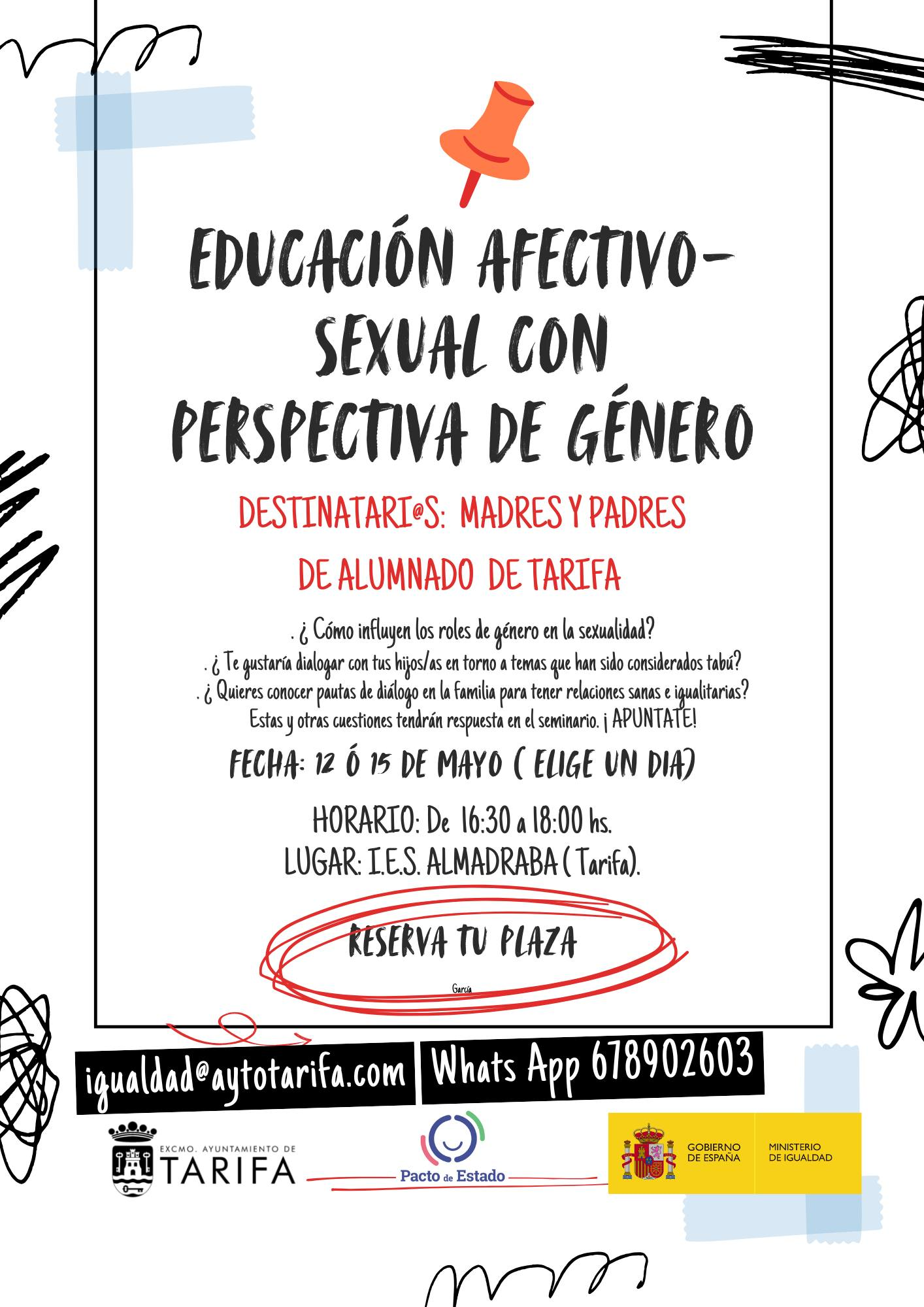 El área de Igualdad del Ayuntamiento de Tarifa, en el marco del Pacto de Estado contra la Violencia de Género, ha programado un seminario sobre “Educación afectivo-sexual con perspectiva de género” dirigido a las familias de la comunidad educativa. La iniciativa, gratuita y con plazas limitadas, abordará temas de interés para la formación sexual y emocional de menores y jóvenes del municipio.