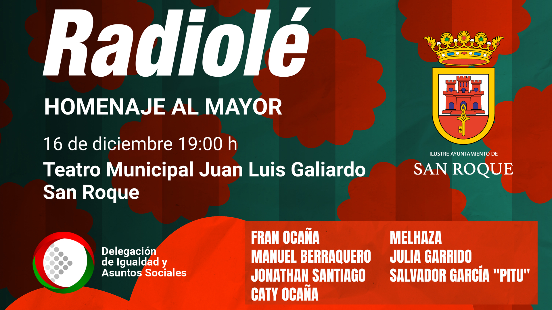 Por tercer año consecutivo, el Teatro Juan Luis Galiardo acogerá la Gala Radiolé en Homenaje al Mayor, que se celebrará el lunes 16 de diciembre a las 19.00 horas. Se contará con las actuaciones de Fran Ocaña, Manuel Berraquero, Jonathan Santiago, Caty Ocaña, el trío Melhaza, Julia Garrido y Salvador García “Pitu”.
