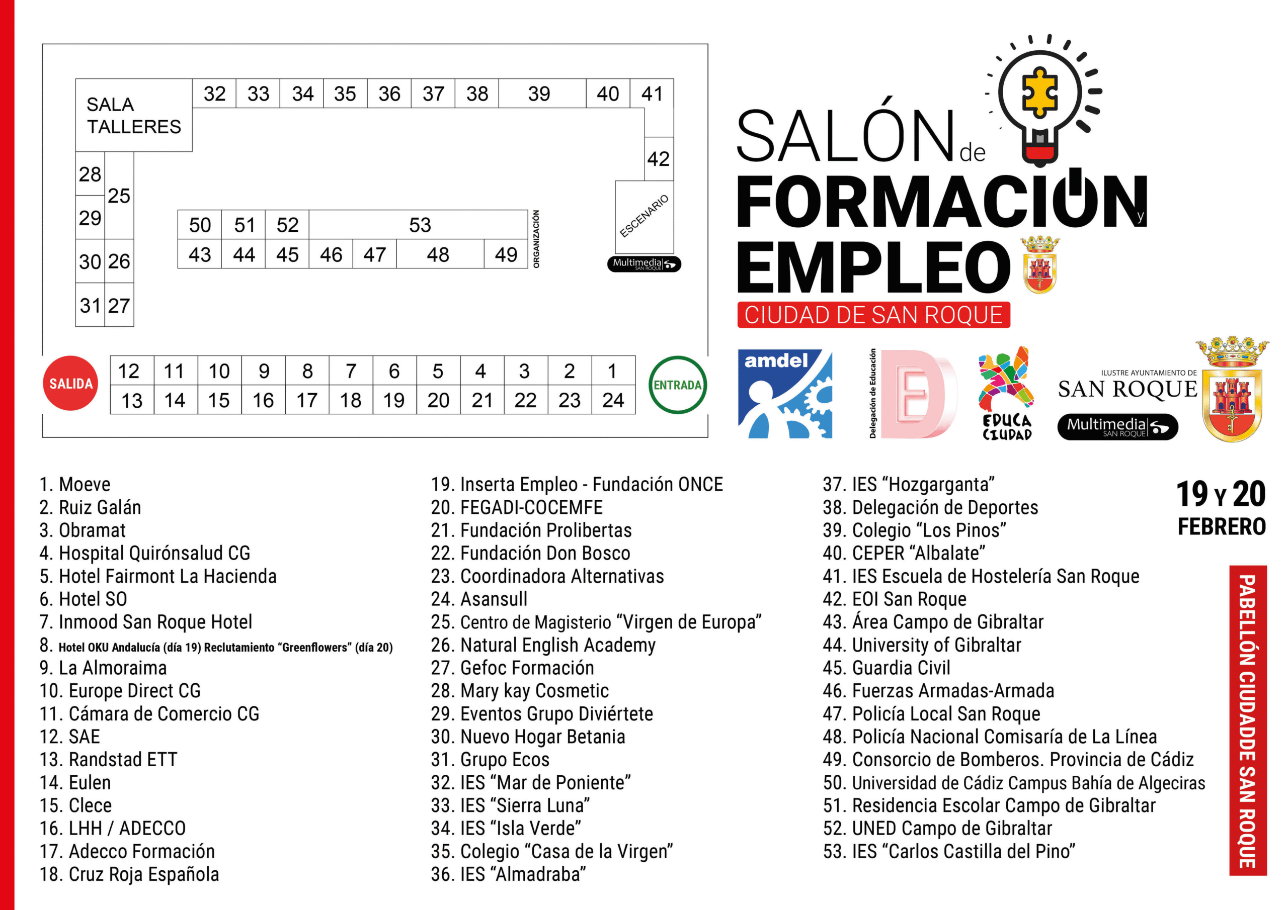 En cuanto a las empresas, centros educativos y entidades participantes, habrá un total de 53 stands. Han confirmado su asistencia: Moeve, Ruiz Galán, Obramat, Hospital Quirónsalud, Hotel Fairmont La Hacienda, SO/ Sotogrande, Hotel Oku Andalucía, Greenflowers, La Almoraima, Europe Direct, Cámara de Comercio, SAE, Randstad, Eulen, Clece, LHH/Adecco, Adecco Formación, Cruz Roja Española, Inserta Empleo-Fundación ONCE, Fegadi-Cocemfe, Fundación Prolibertas, Fundación Don Bosco, Coordinadora Alternativas, Asansull, Centro de Magisterio Virgen de Europa, Natural English Academy, Gefoc Formación, Mary Kay Cosmetic, Eventos Grupo Diviértete, Nuevo Hogar Betania, Grupo Ecos, IES Mar de Poniente, IES Sierra Luna, IES Isla Verde, Colegio Casa de la Virgen, IES Almadraba, IES Hozgarganta, Delegación de Deportes Ayto de San Roque, Colegio Los Pinos, CEPER Albalate, IES Escuela de Hostelería, EOI San Roque, Área Campo de Gibraltar, University of Gibraltar, Guardia Civil, Fuerzas Armadas-Armada, Policía Local San Roque, Policía Nacional Comisaría de La Línea, Consorcio Provincial de Bomberos Cádiz, Universidad de Cádiz-Campus Bahía de Algeciras, Residencia Escolar Campo de Gibraltar, UNED Campo de Gibraltar e IES Carlos Castilla del Pino.