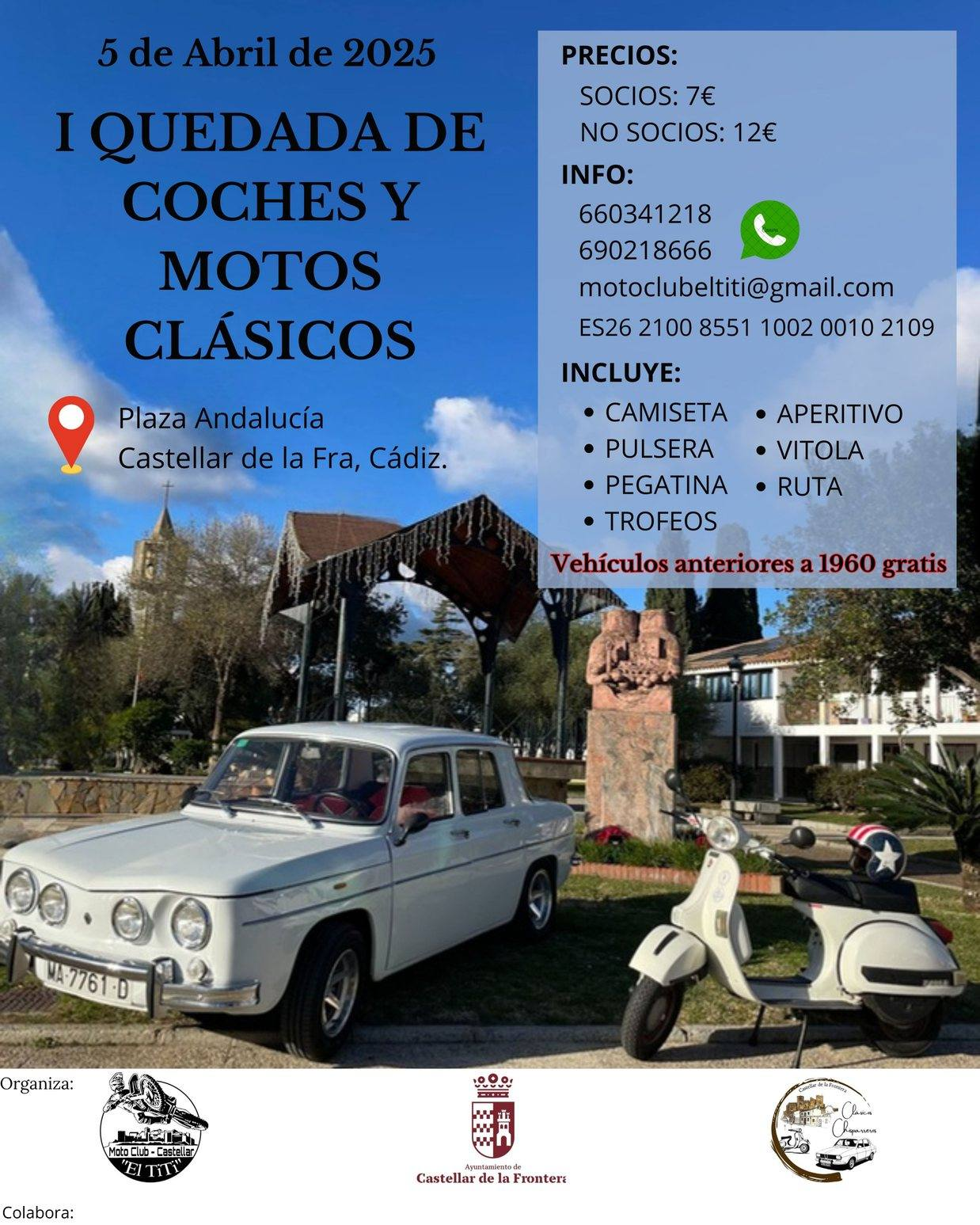 El próximo 5 de abril de 2025, Castellar de la Frontera será el escenario de la I Quedada de Coches y Motos Clásicos, un evento que reunirá a apasionados de los vehículos históricos en la Plaza Andalucía.