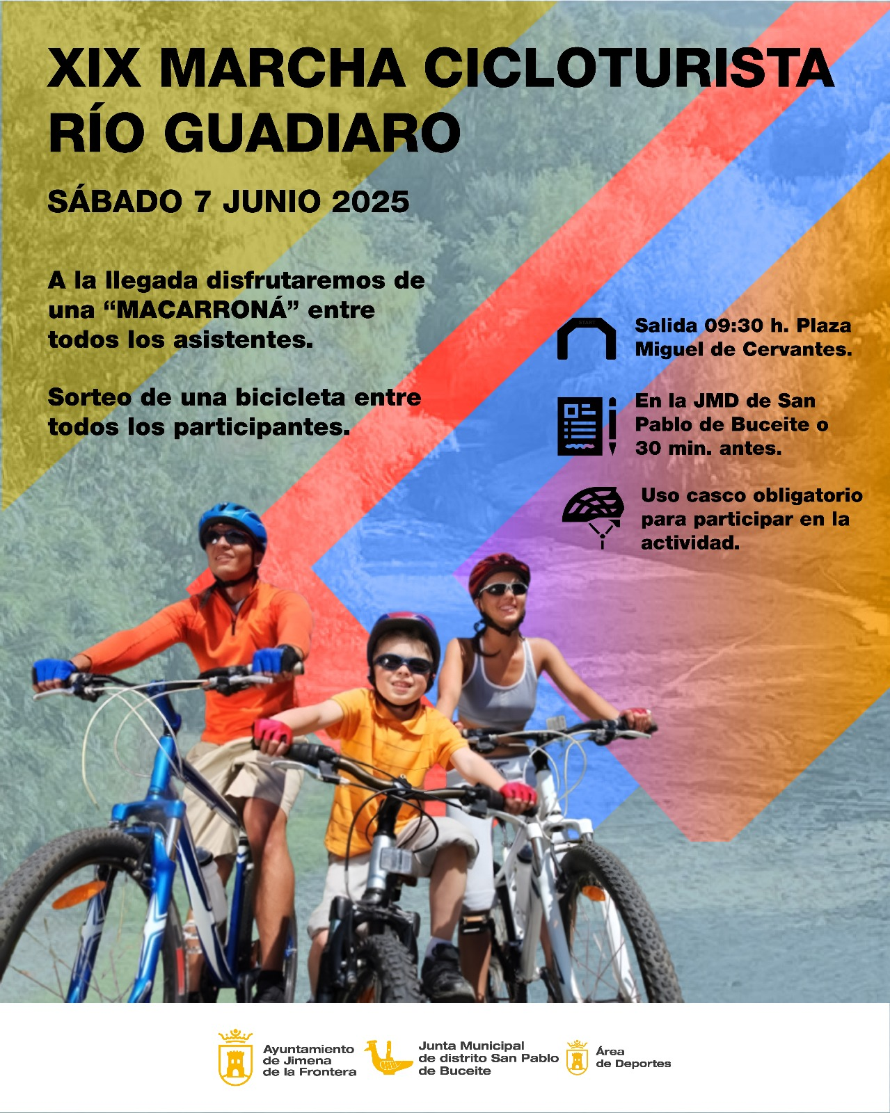 La Junta Municipal de Distrito de San Pablo de Buceite, en colaboración con el Área de Deportes del Ayuntamiento de Jimena, organiza la XIX Edición de la Marcha Cicloturista “Río Guadiaro”, que se celebrará el sábado 7 de junio de 2025.