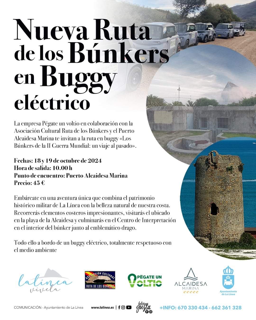 La delegación municipal de Turismo informa del comienzo de una iniciativa conjunta entre la empresa Pégate un voltio, la Asociación Cultural Ruta de los Bunkers y el puerto deportivo Alcaidesa Marina para realizar la ruta en buggy eléctrico, ‘Los búnkeres de la II Guerra Mundial: un viaje al pasado’.