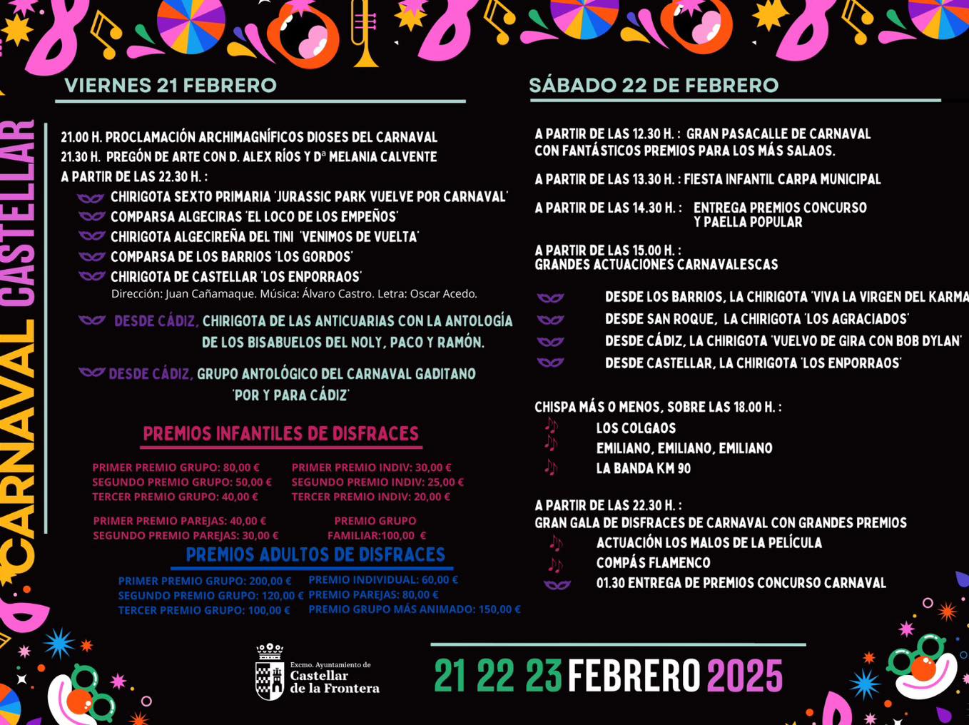 Castellar de la Frontera se viste de fiesta con la tan esperada programación del Carnaval 2025, que tendrá lugar el viernes 21 y sábado 22 de febrero. La cita promete momentos inolvidables, con una variada gama de actividades que incluyen concursos, desfiles y actuaciones musicales, además de premios incrementados para el Concurso de Disfraces tanto infantil como para adultos.